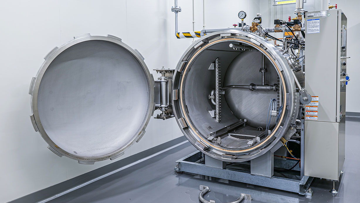 食品容器を高温高圧でしっかり殺菌。常温で長持ちする食品を
